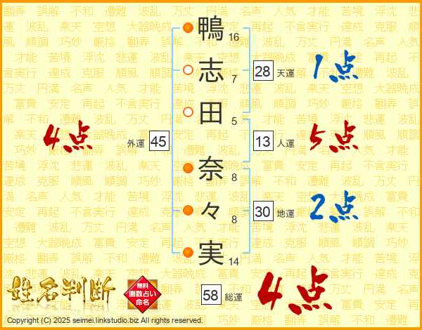 鴨(16画)志(7画)田(5画) 奈(8画)々(8画)実(14画)