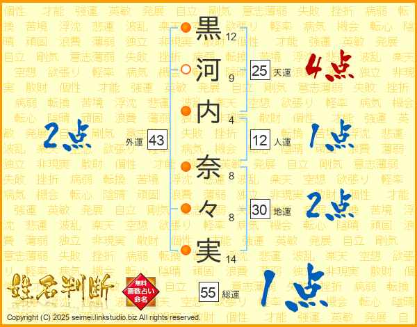 黒(12画)河(9画)内(4画) 奈(8画)々(8画)実(14画)