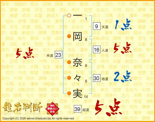 一(1画)岡(8画)  奈(8画)々(8画)実(14画)