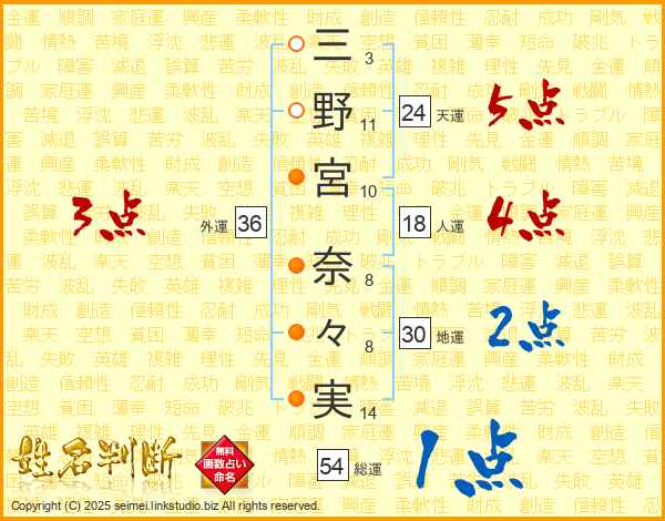 三(3画)野(11画)宮(10画) 奈(8画)々(8画)実(14画)