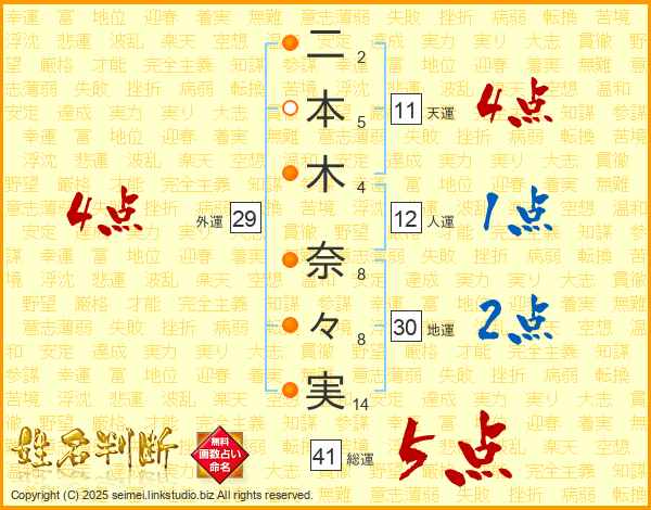 二(2画)本(5画)木(4画) 奈(8画)々(8画)実(14画)