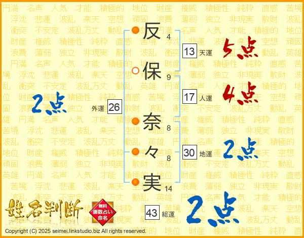 反保奈々実さんの総運は43画の2点!
