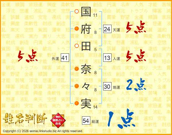 国(11画)府(8画)田(5画) 奈(8画)々(8画)実(14画)