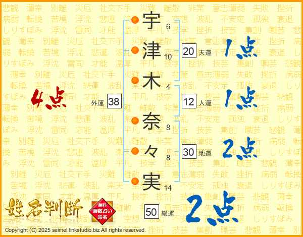 宇(6画)津(10画)木(4画) 奈(8画)々(8画)実(14画)