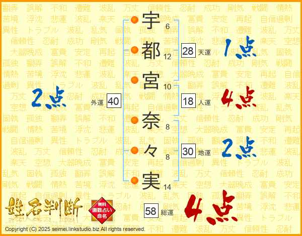 宇(6画)都(12画)宮(10画) 奈(8画)々(8画)実(14画)