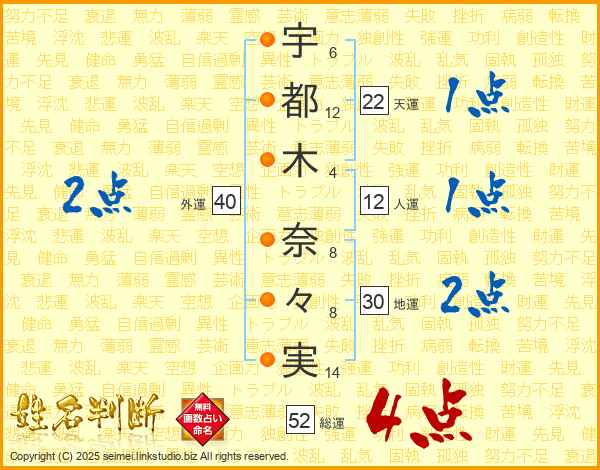 宇(6画)都(12画)木(4画) 奈(8画)々(8画)実(14画)