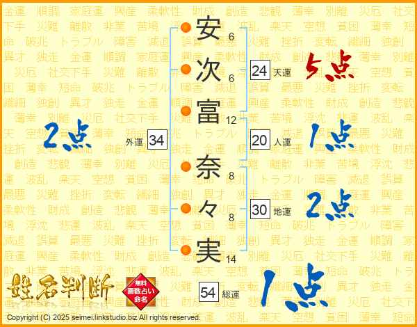 安(6画)次(6画)富(12画) 奈(8画)々(8画)実(14画)