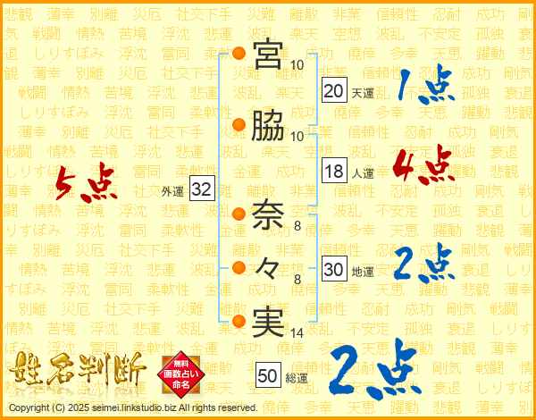 宮(10画)脇(10画) 奈(8画)々(8画)実(14画)
