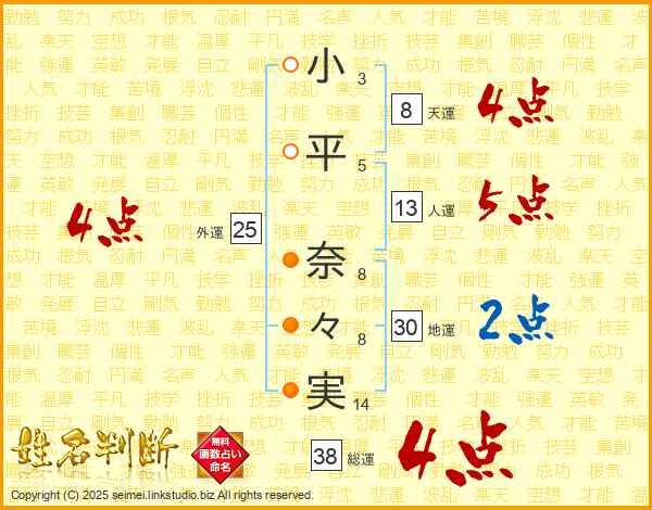 小(3画)平(5画) 奈(8画)々(8画)実(14画)