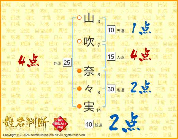 山(3画)吹(7画) 奈(8画)々(8画)実(14画)