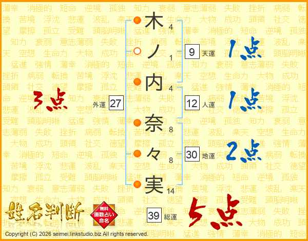 木ノ内奈々実さんの総運は39画の5点!