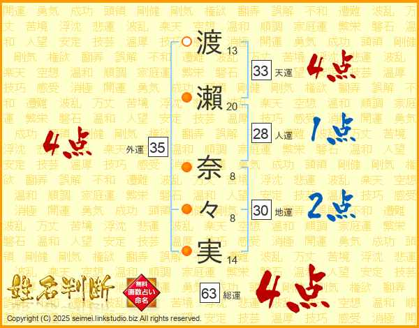 渡瀨奈々実さんの総運は63画の4点!