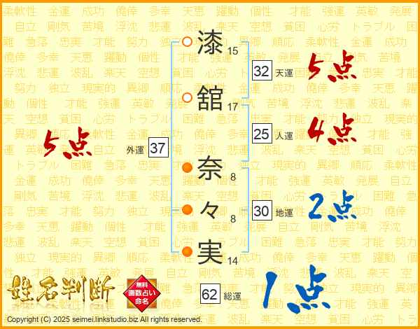 漆(15画)舘(17画) 奈(8画)々(8画)実(14画)