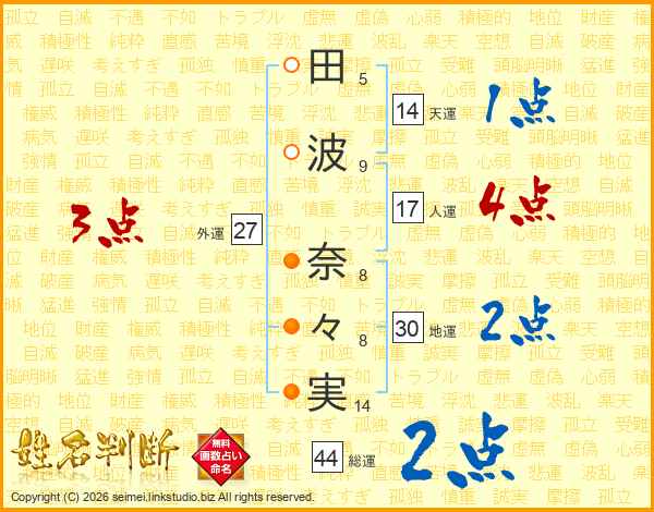 田(5画)波(9画) 奈(8画)々(8画)実(14画)