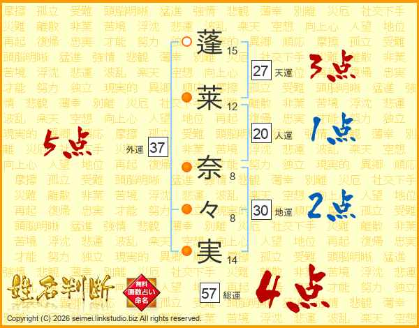 蓬(15画)莱(12画) 奈(8画)々(8画)実(14画)