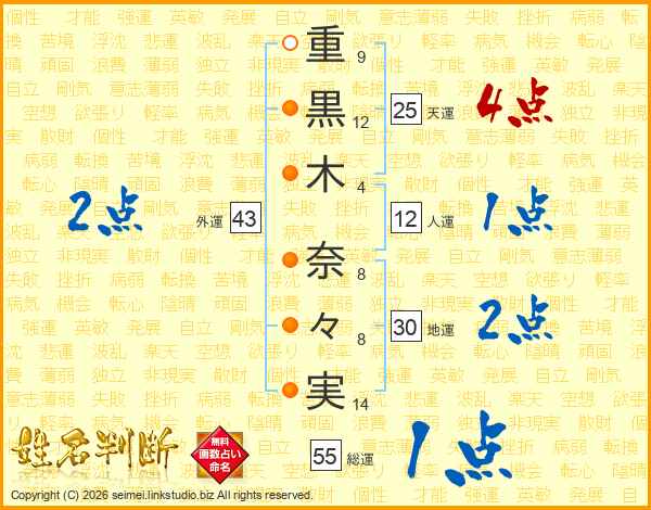 重(9画)黒(12画)木(4画) 奈(8画)々(8画)実(14画)