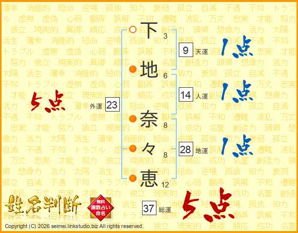 下(3画)地(6画) 奈(8画)々(8画)恵(12画)