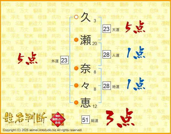 久(3画)瀬(20画) 奈(8画)々(8画)恵(12画)