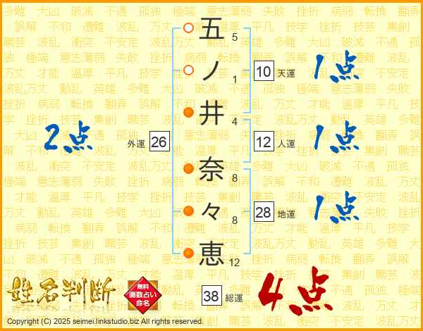 五(5画)ノ(1画)井(4画) 奈(8画)々(8画)恵(12画)