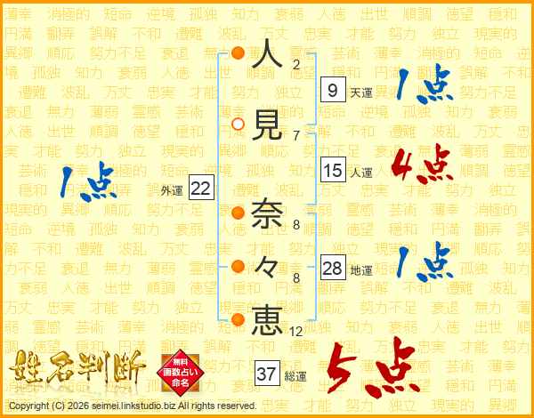 人(2画)見(7画) 奈(8画)々(8画)恵(12画)