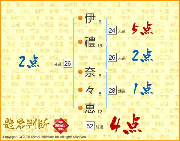 伊(6画)禮(18画) 奈(8画)々(8画)恵(12画)