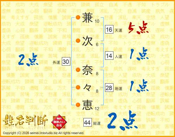 兼(10画)次(6画) 奈(8画)々(8画)恵(12画)