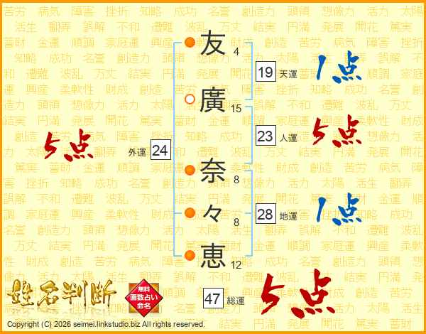 友(4画)廣(15画) 奈(8画)々(8画)恵(12画)