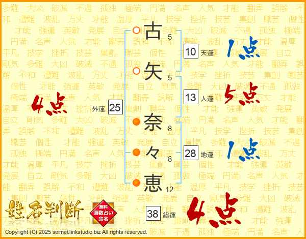 古(5画)矢(5画) 奈(8画)々(8画)恵(12画)