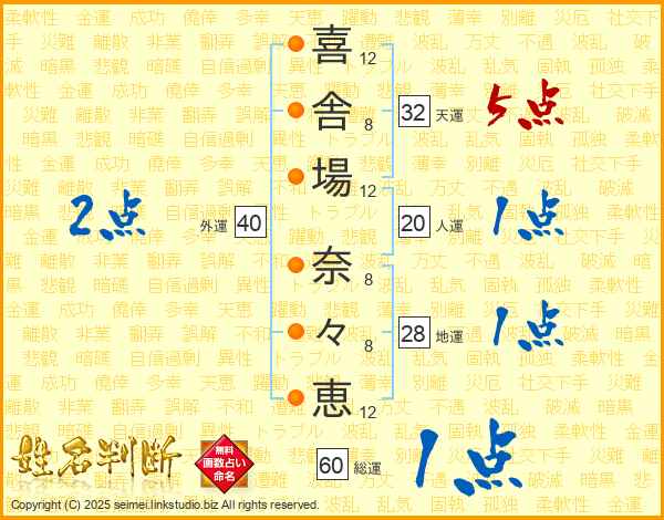 喜(12画)舎(8画)場(12画) 奈(8画)々(8画)恵(12画)