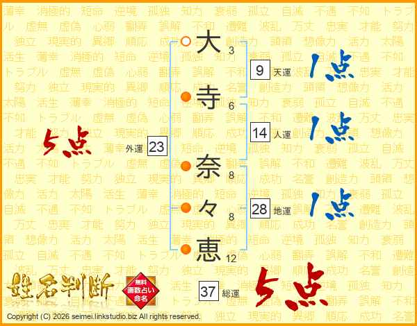 大(3画)寺(6画) 奈(8画)々(8画)恵(12画)