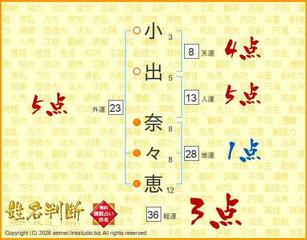 小(3画)出(5画) 奈(8画)々(8画)恵(12画)