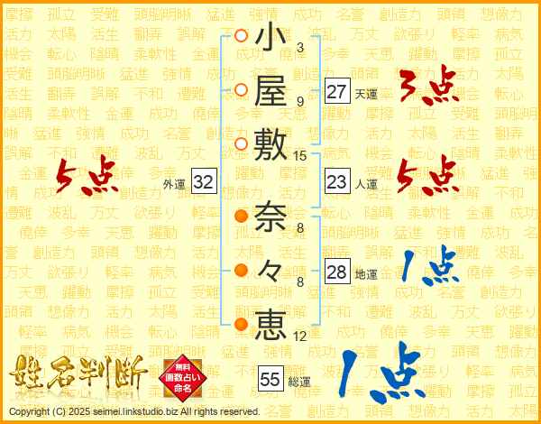 小(3画)屋(9画)敷(15画) 奈(8画)々(8画)恵(12画)