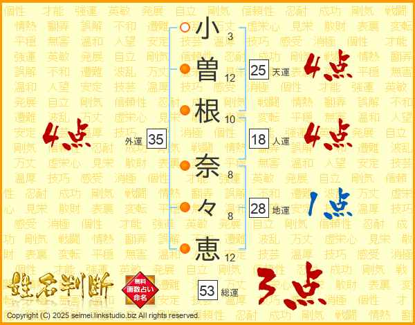 小(3画)曽(12画)根(10画) 奈(8画)々(8画)恵(12画)