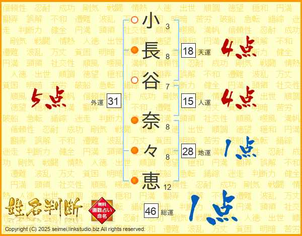 小(3画)長(8画)谷(7画) 奈(8画)々(8画)恵(12画)
