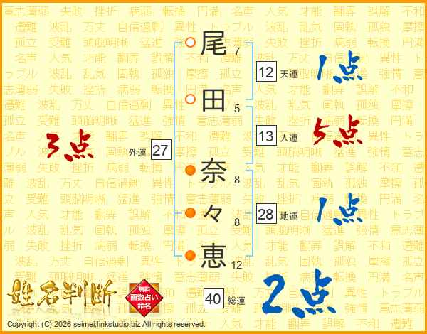 尾(7画)田(5画) 奈(8画)々(8画)恵(12画)