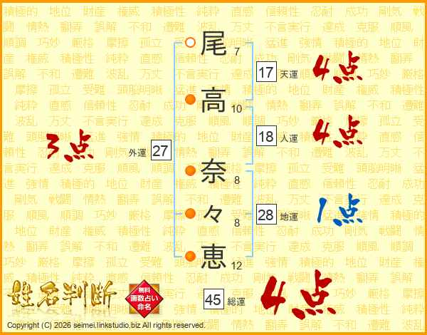 尾(7画)高(10画) 奈(8画)々(8画)恵(12画)