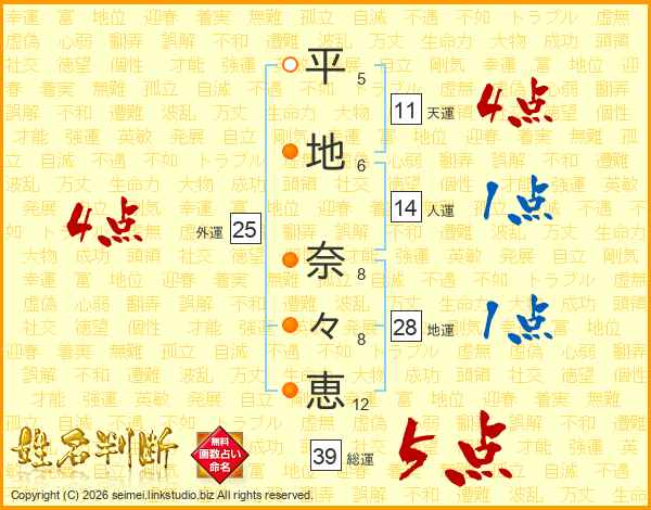 平(5画)地(6画) 奈(8画)々(8画)恵(12画)