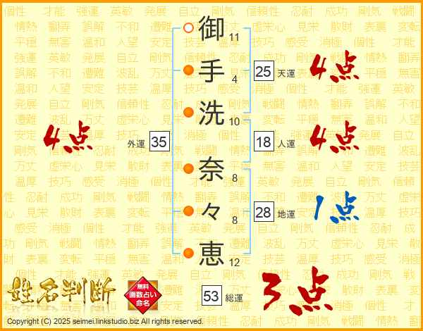 御(11画)手(4画)洗(10画) 奈(8画)々(8画)恵(12画)