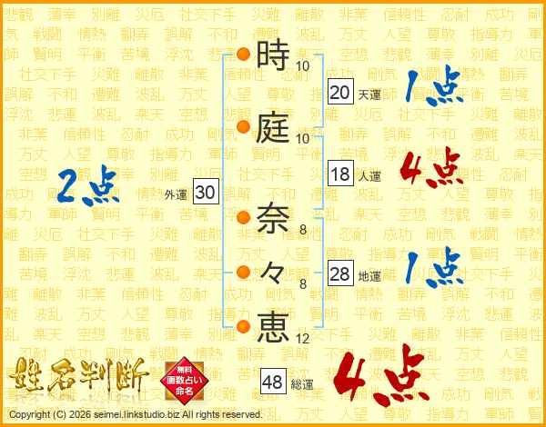 時(10画)庭(10画) 奈(8画)々(8画)恵(12画)