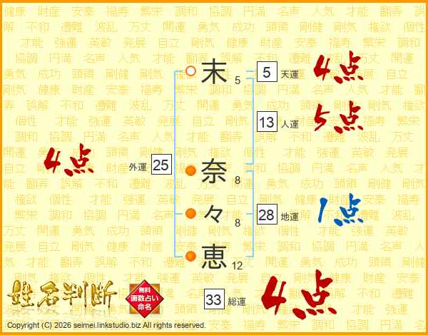 生活面を象徴する運勢です。外部から受ける影響力を表し、結婚運、家庭運や職場、環境への順応性を表します。総運から人運を引いた画数。姓や名が1文字の場合を除く。