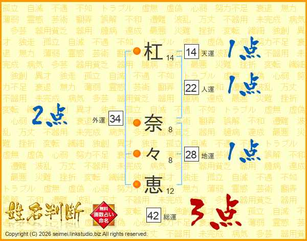 杠(14画) 奈(8画)々(8画)恵(12画)