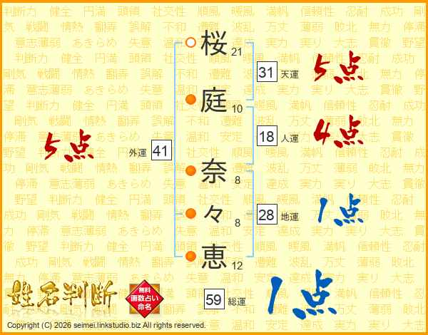 桜(21画)庭(10画) 奈(8画)々(8画)恵(12画)