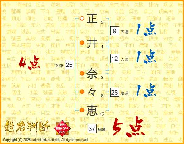 正(5画)井(4画) 奈(8画)々(8画)恵(12画)