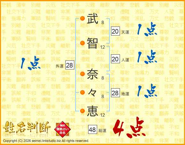 武(8画)智(12画) 奈(8画)々(8画)恵(12画)