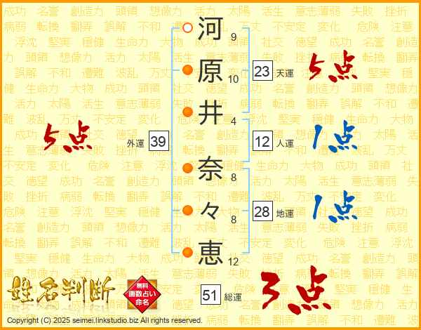 河(9画)原(10画)井(4画) 奈(8画)々(8画)恵(12画)