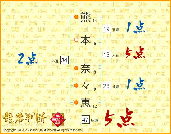熊(14画)本(5画) 奈(8画)々(8画)恵(12画)