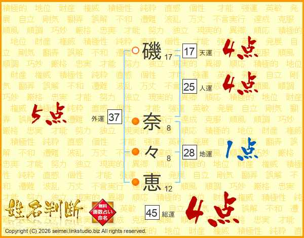 磯(17画) 奈(8画)々(8画)恵(12画)