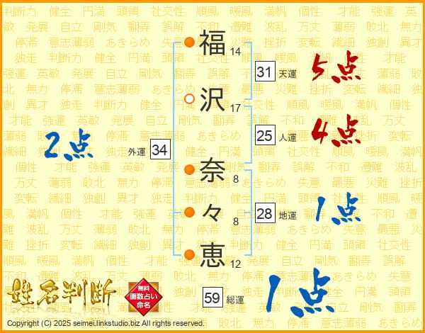 福(14画)沢(17画) 奈(8画)々(8画)恵(12画)
