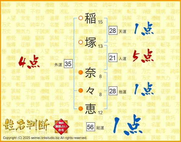 稲(15画)塚(13画) 奈(8画)々(8画)恵(12画)