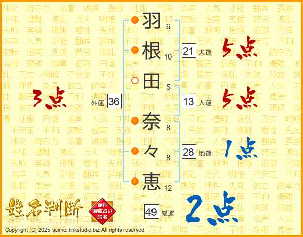 羽(6画)根(10画)田(5画) 奈(8画)々(8画)恵(12画)